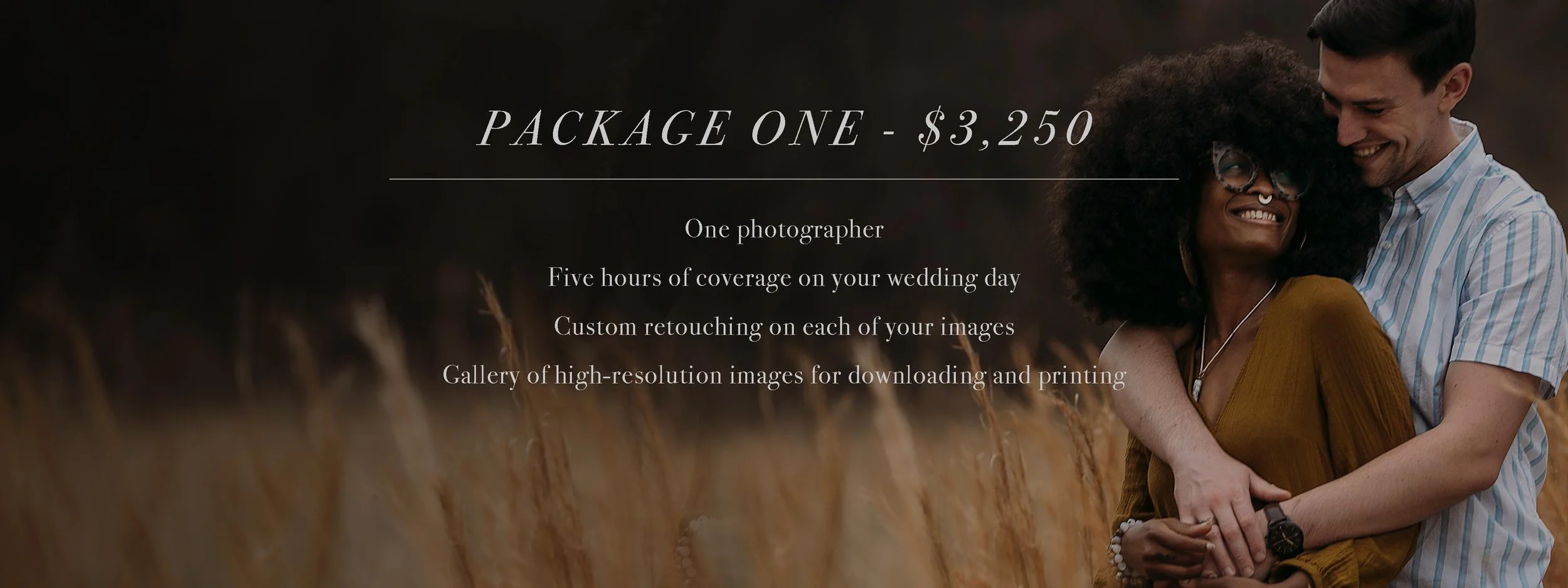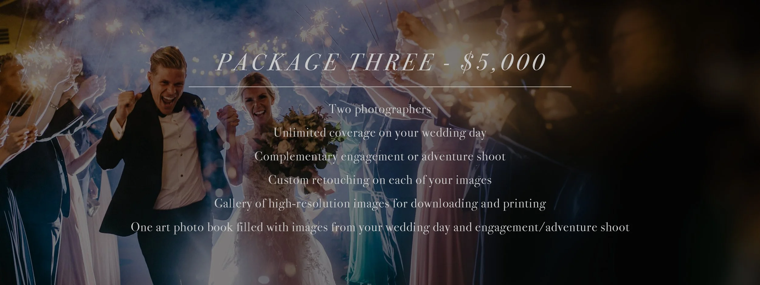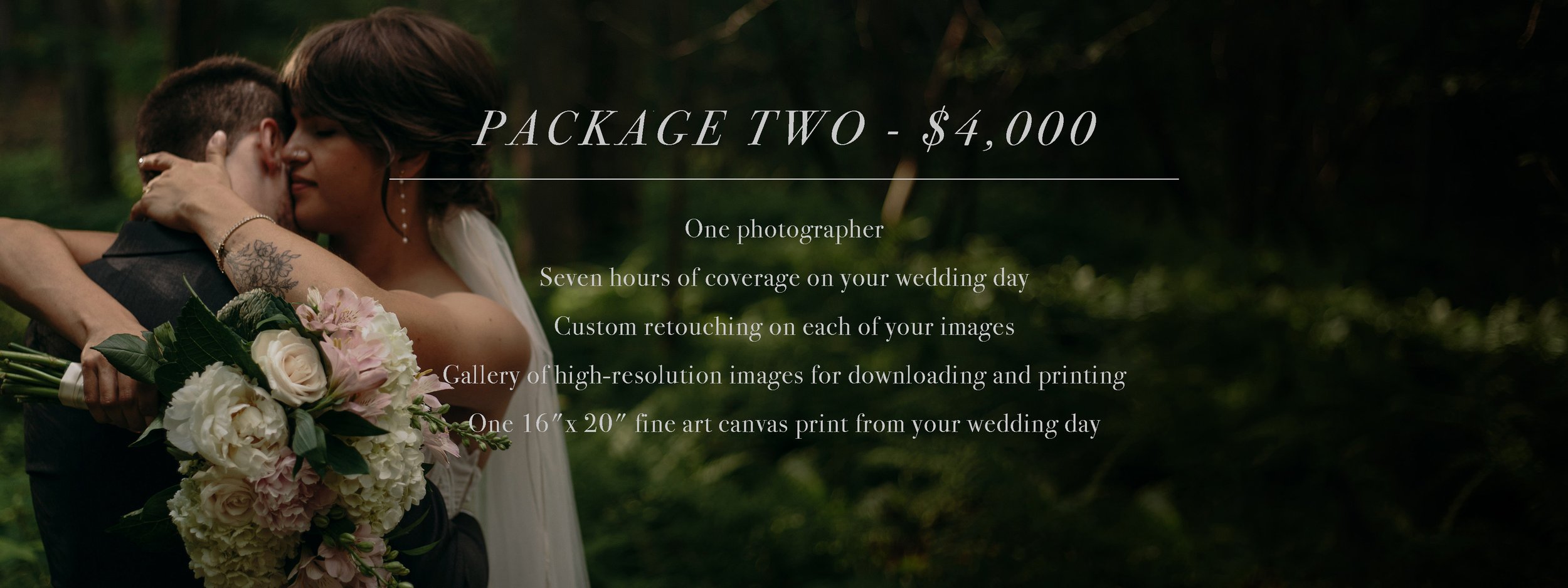 I know weddings aren’t cheap. Photographs of your special day are one of the only truly permanent and lasting investments, that I guarantee you won’t regret. That said, don’t be afraid to request a modification - I’m always happy to help with your budget, however I’m able.